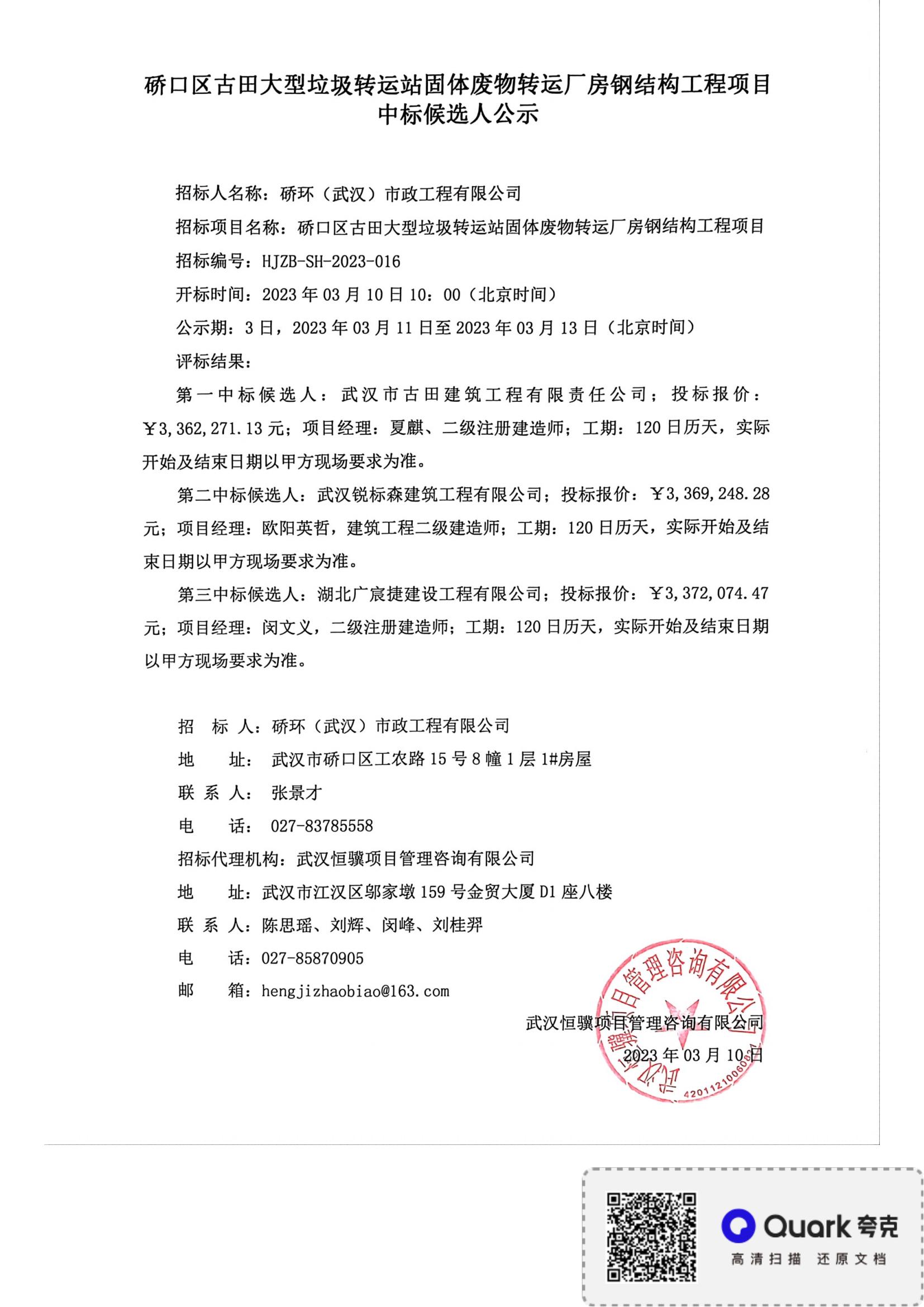 固體廢物轉運廠房鋼結構工程項目中標候選人公
