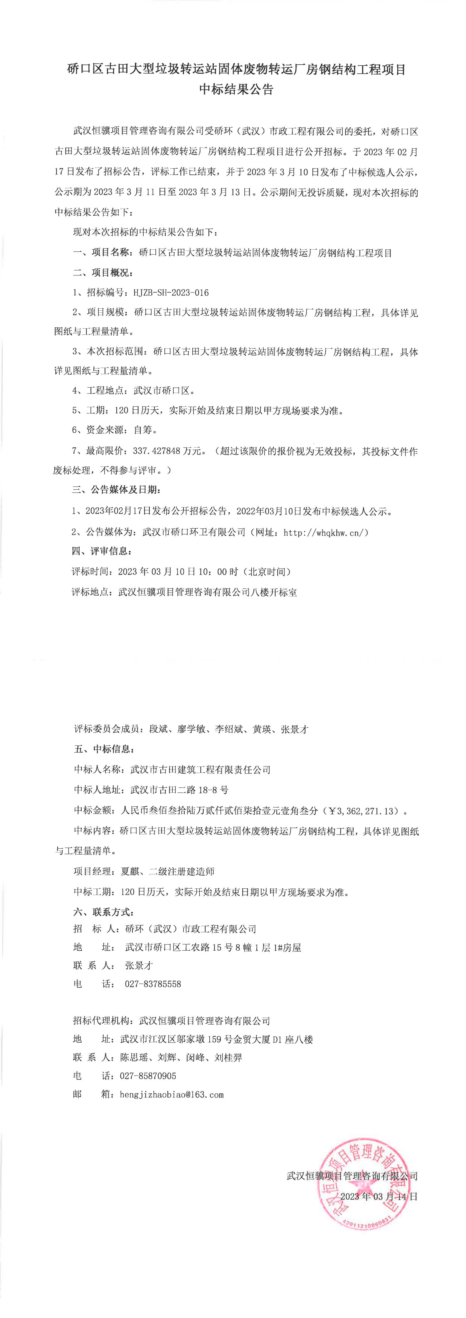 固體廢物轉運廠房鋼結構工程項目中標結果公示