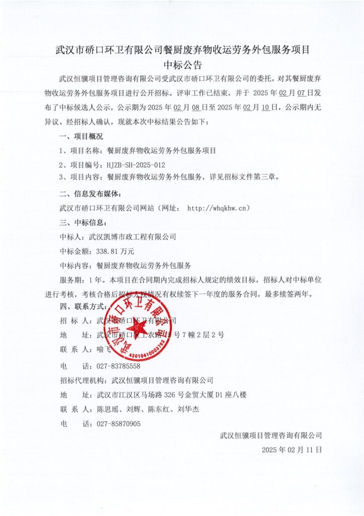 硚環(huán)公司餐廚廢棄物收運(yùn)勞務(wù)外包服務(wù)項(xiàng)目中標(biāo)候選人公示