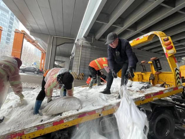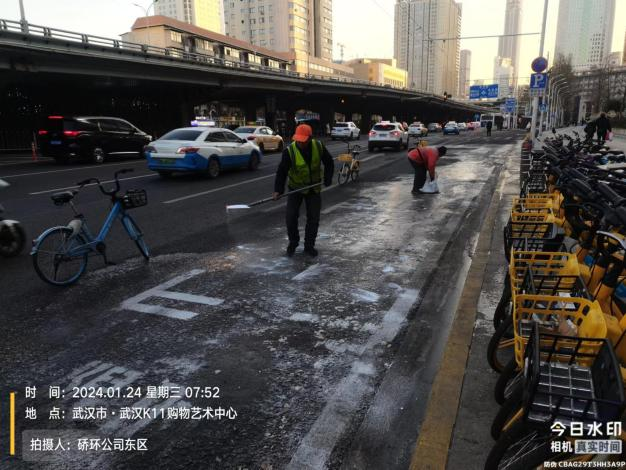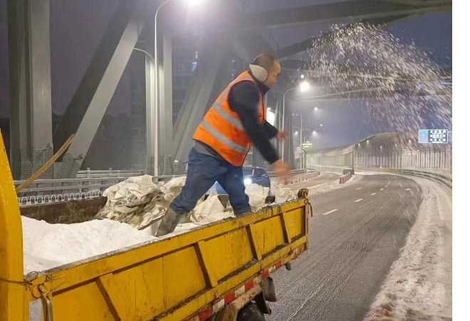 截止至24日早7點,硚環公司已出動應急人員125人次、出動車輛29臺次、對全區主次干道、環線、高架、易結冰部位不間斷巡查,預灑融雪劑12.9噸,鋪設草墊900條。