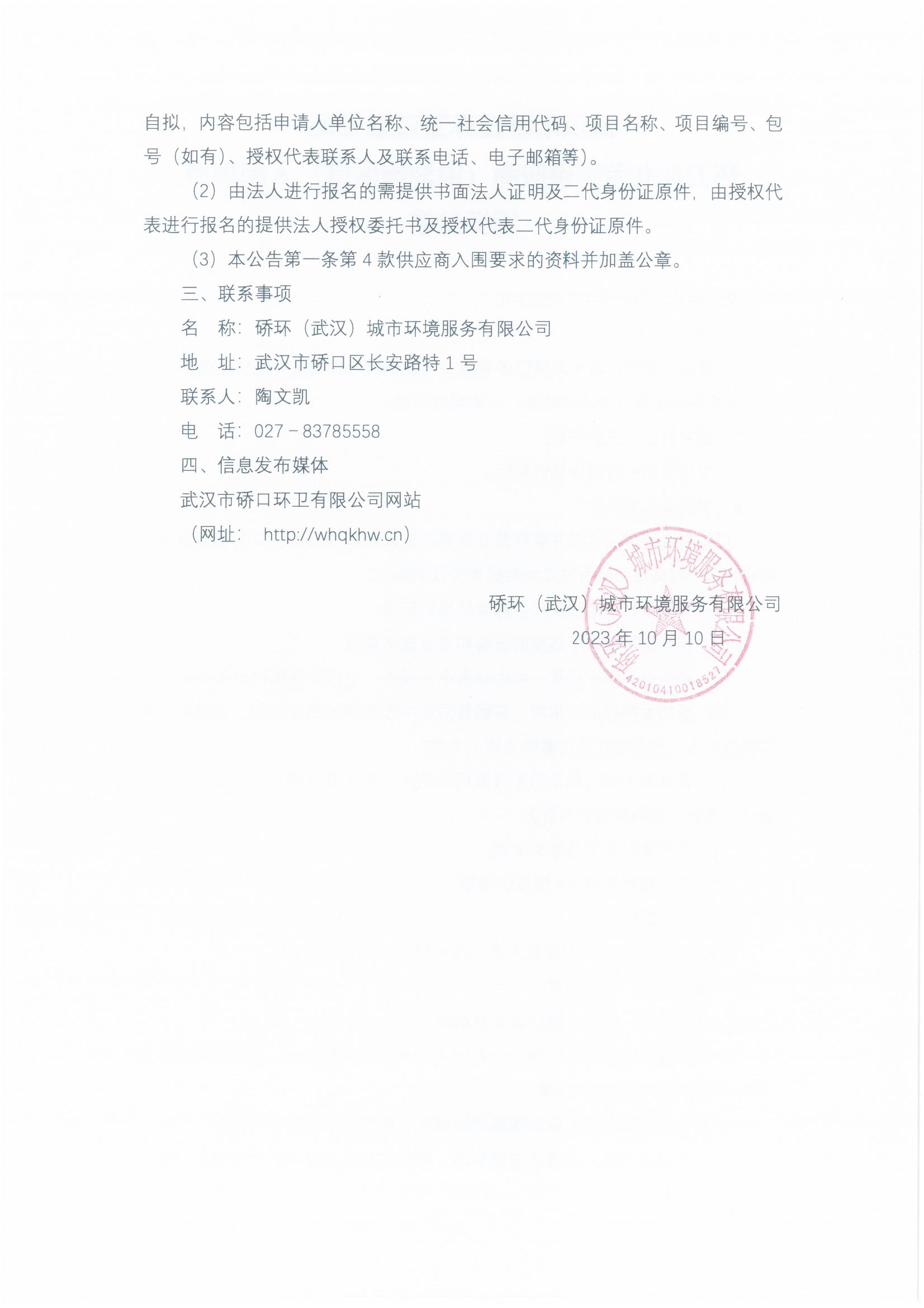 1、武漢市硚口環衛有限公司邀請符合資格條件的公司參與武漢市硚口環衛有限公司作業車輛供應商入庫項目活動。