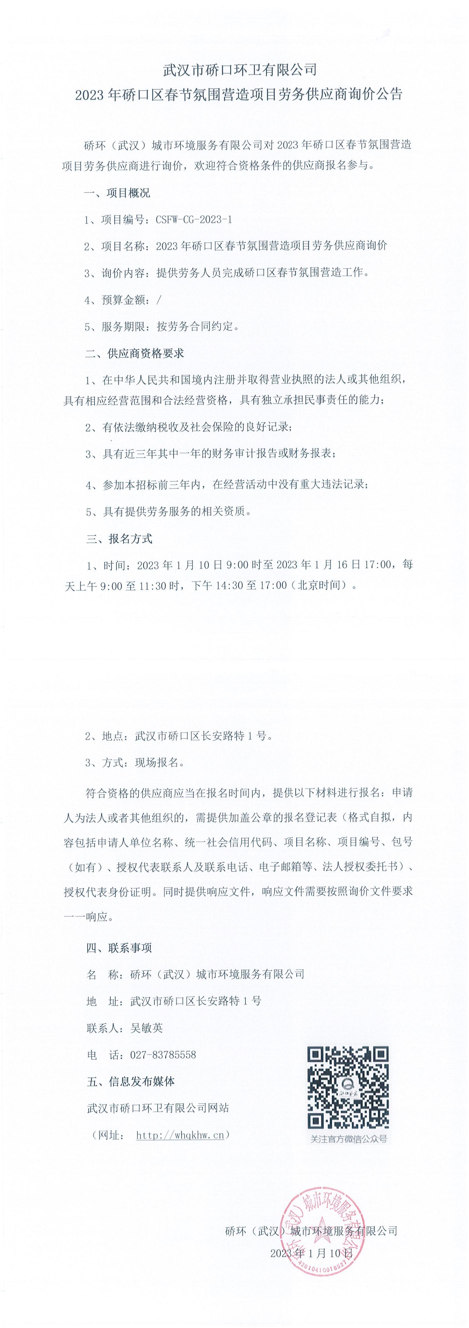 2023年春節氛圍營造項目勞務供應商詢價公告